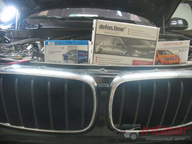 Авто защитили установкой иммобилайзера Игла 271, блоком управления капота Contour, замком капота Defen.time, перепиновали OBD-разъем и защитили систему бесключевого доступа.