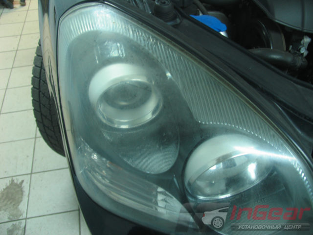 ксеноновые линзы 2.5 дюйма. Года берут свое и пластик фар стал выглядеть печально — но на этой стадии еще помогает полировка. После полировки фары обязательно нужно оклеивать антигравийной пленкой, т.к. полировка неизбежно снимает защитный слой на фарах — если пленкой не заклеивать, то через несколько месяцев оптика станет выглядеть еще хуже, чем было изначально. Цены на установку линз можно узнать тут.