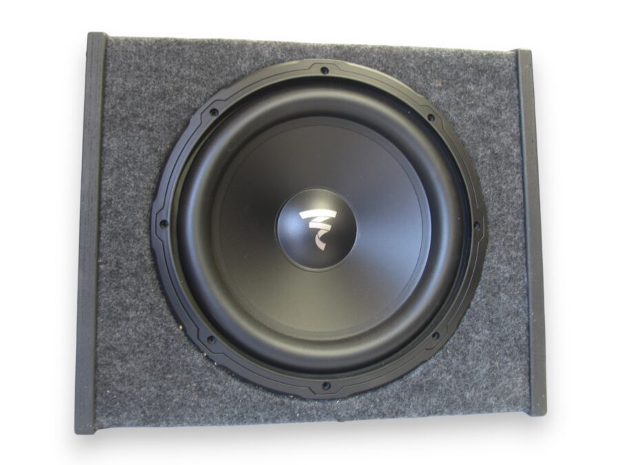 Сабвуфер среднего уровня Focal в ящике, изготовленном из клееной фанеры и обшитом карпетом.