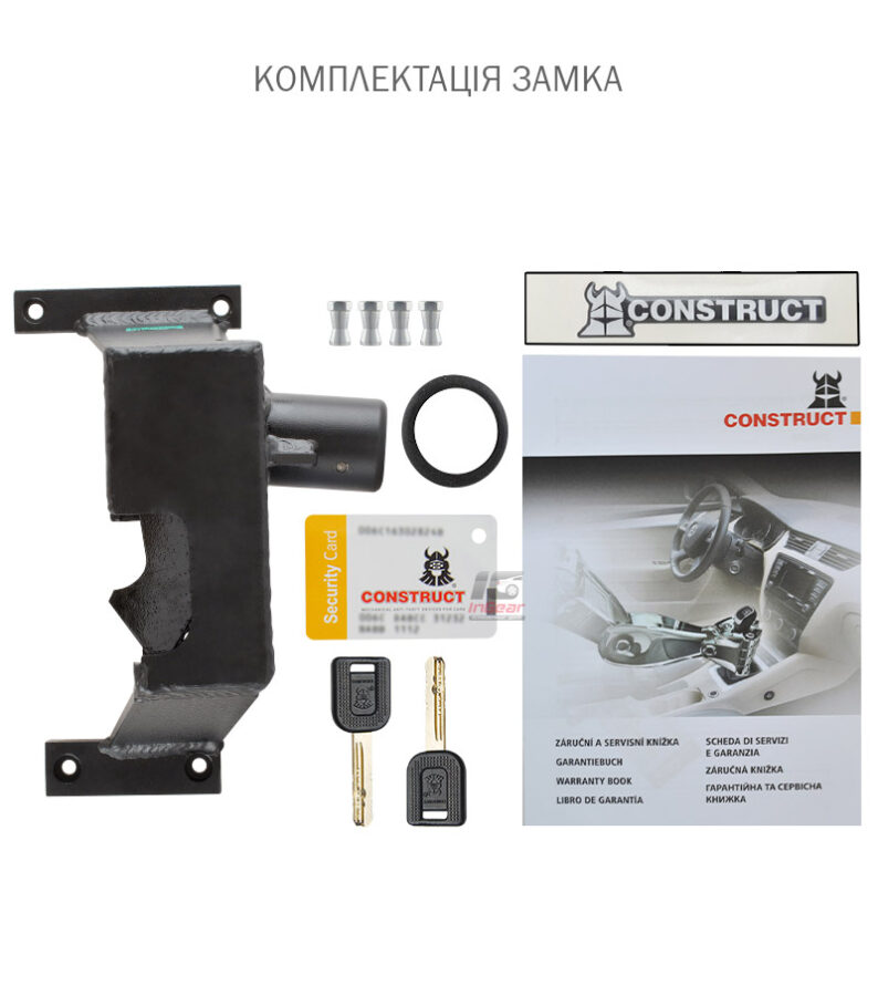 CONSTRUCT GEAR – механический противоугонный замок коробки переключения скоростей (КПШ). Имеет уникальную конструкцию для конкретной модели автомобиля и КПП. Устанавливается с помощью срывных болтов на штатные крепи в кузове автомобиля. Принцип работы механического противоугонного замка CONSTRUCT GEAR состоит в блокировке подвижных узлов механизма переключения скоростей. Механические КПП блокируются в положении «R» — задний ход, а автоматические — в положении «P» — паркинг. Для замыкания нужно перевести рычаг КПП в нужное положение, вставить ключ в замок до упора и повернуть ключ на 180° в крайнее положение.