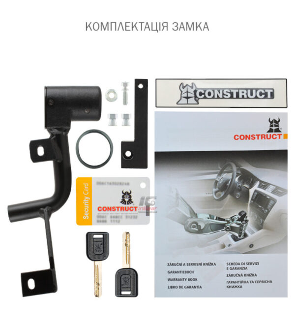 CONSTRUCT GEAR – механический противоугонный замок коробки переключения скоростей (КПШ). Имеет уникальную конструкцию для конкретной модели автомобиля и КПП. Устанавливается с помощью срывных болтов на штатные крепи в кузове автомобиля. Принцип работы механического противоугонного замка CONSTRUCT GEAR заключается в блокировке подвижных узлов механизма переключения скоростей. Механические КПШ блокируются в положении “R” – задний ход, а автоматические – в положении “P” – паркинг. Для замыкания нужно перевести рычаг КПП в нужное положение, вставить ключ в замок до упора и повернуть ключ на 180° в крайнее положение.